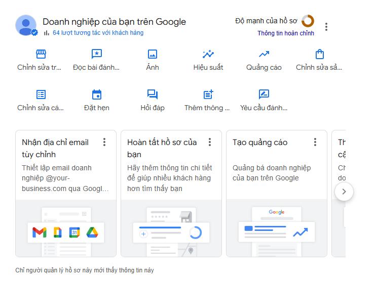 Để bắt đầu, hãy truy cập vào tài khoản Google My Business. Dashboard sẽ trông giống như hình dưới đây: